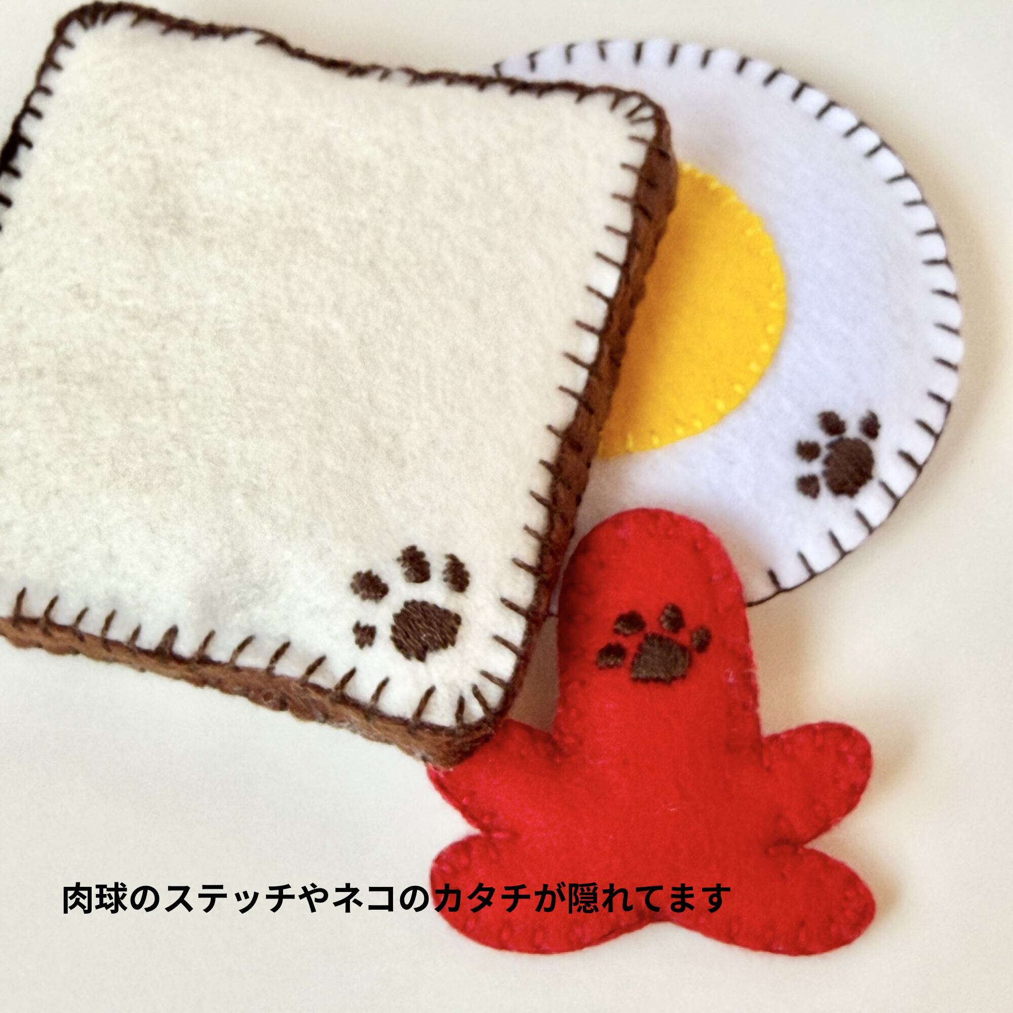 ネコのかたちや小さな肉球のステッチをしのばせています。そっと見つけていただけたらうれしいです。